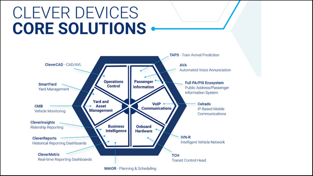 Clever Devices describes itself as “a leading provider of technology solutions for all modes of public transportation, including passenger rail, fixed-route, bus rapid transit, and paratransit, serving more than half of North America’s top 20 transit agencies. We deliver scalable and modular Intelligent Transportation Systems (ITS), providing benefits to transit system operators and the riding public, including increased operational efficiencies, enhanced safety, and better passenger experiences. Clever Devices’ mission is to make meaningful contributions to worldwide mobility. Our solutions enhance mobility and help meet the public transportation challenges of communities around the world. We strive to be at the forefront of innovation, using technology to drive the next generation of public transportation.”