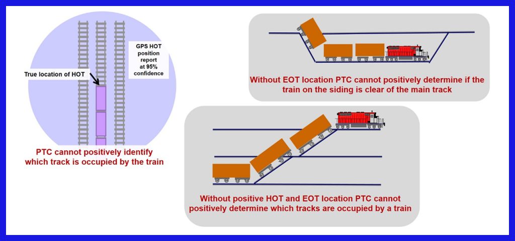 The ability to precisely locate and track train movement on the rail network is the cornerstone of modern train control systems. The Interoperable Electronic Train Management System (I-ETMS) and Positive Train Control (PTC) systems currently used by Class I railroads, operational on approximately 54,000 route-miles, rely on the Global Positioning System (GPS) to identify the location of the train lead locomotive, crew-entered track information, and switch position. The location of the rear of the train is then derived from the location of the lead locomotive using the train length, typically provided by the railroad’s management information systems (MIS) and confirmed or updated by the locomotive engineer.