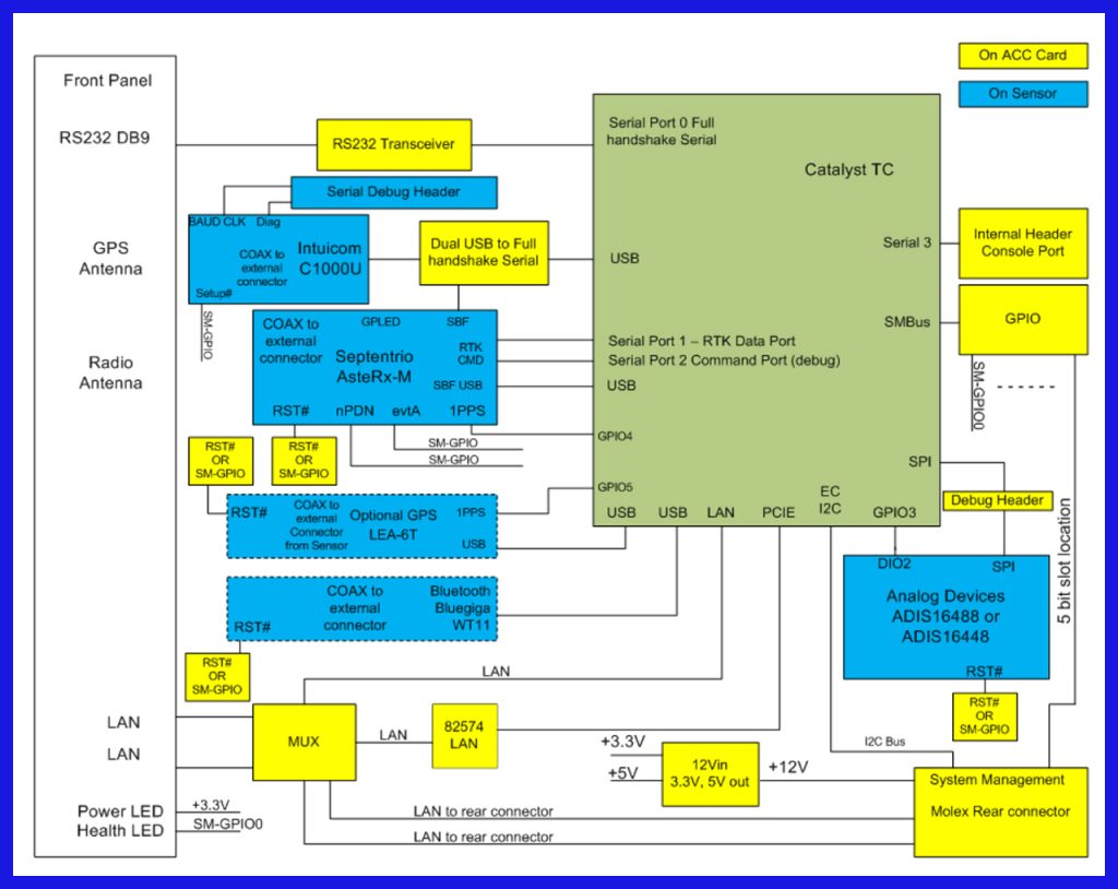 Figure 3 depicts the PTL high-level hardware architecture, consisting of the Catalyst TC processor module, Septentrio AsteRx-m GNSS receiver, Analog Devices ADIS16448 Inertial Measurement Unit, and Intuicom C1000µ 900-MHz radio.