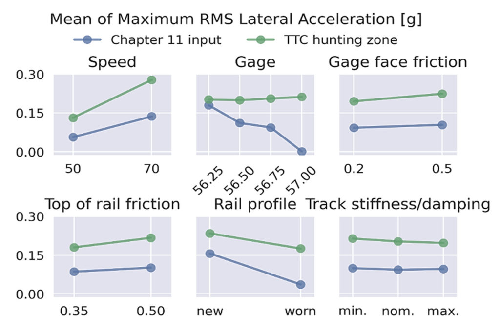 The simulation results (Figure 2) suggest that consistent track conditions near THD sites are necessary for the consistent assessment of truck hunting and can be achieved within reasonable tolerances through controlling track geometry and lubrication, as well as grinding to restore rail profiles.