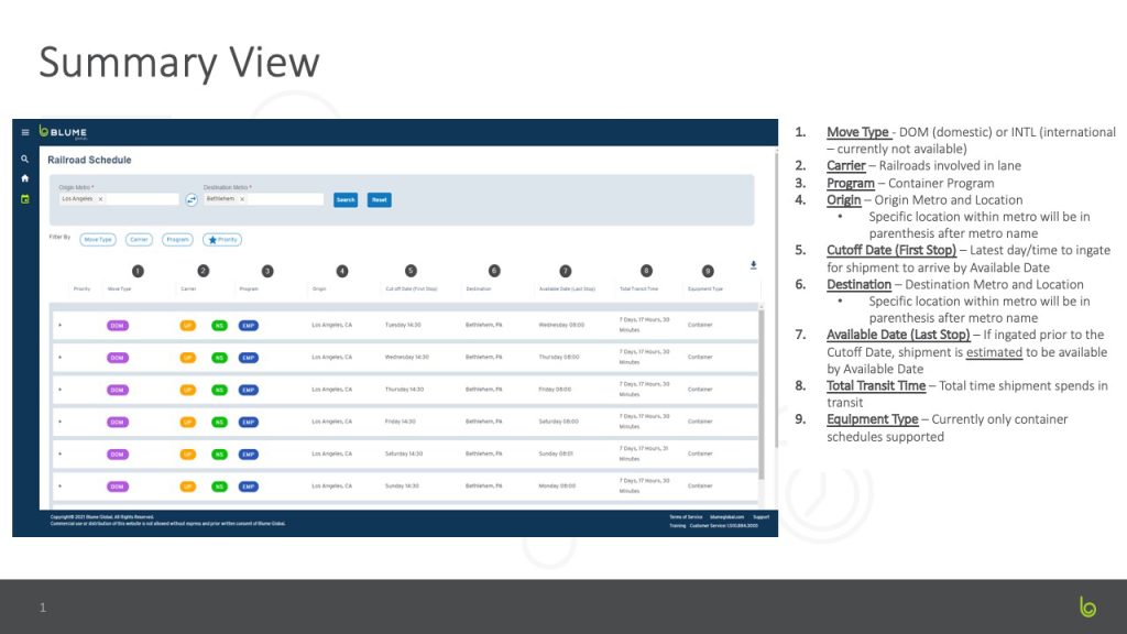 “Blume Global boasts exclusive access to decades of market insights in international and domestic multi-modal logistics, and our rich history with North American railroads puts us in the unique position to offer an innovative solution to a decades-old issue,” adds Johar. “This free solution enables better cooperation among railroads and their IMC customers, making sure freight is flowing on the rails as efficiently and effectively as possible. While individual freight cars have been able to be tracked for quite some time, shipment ETAs have been a critical missing piece. Our system addresses this, across all modes—maritime, truck and rail.”