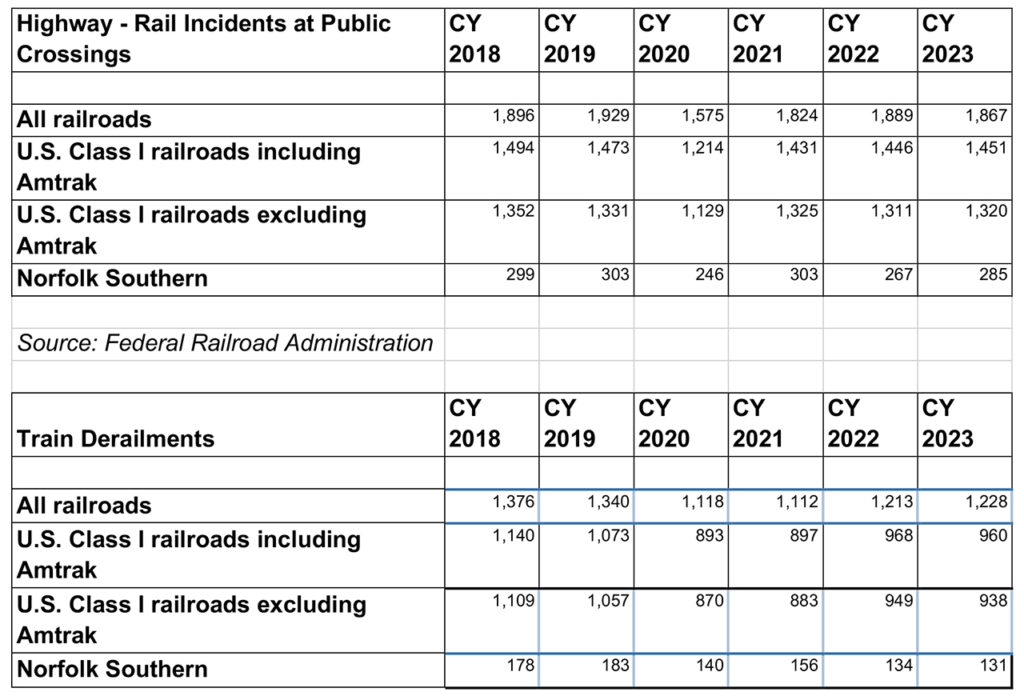 According to the Federal Railroad Administration (FRA), train derailments in 2023 for U.S. operations of the Class I railroads were roughly flat with 2022 but 6% above 2021 levels, while accidents at highway-rail crossings have hovered above 1,300 for every year since 2018, with 2020 being the exception. This excludes Amtrak data.