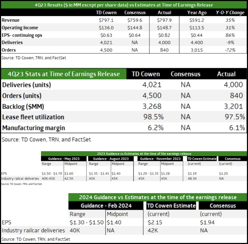 “Adjusted fourth-quarter EPS was a beat aided partly by a tax benefit,” TD Cowen Freight Transportation Equipment Analyst Matt Elkott reported Feb. 22. “Orders were light. Manufacturing margin was 6.1%, just 10 bps lower than our forecast. FLRD remained strong at 23.7% vs. 26.6% third-quarter 2023; utilization 97.5% vs. 98.1% in third-quarter 2023. Guidance $1.30-$1.50 vs. our estimate of $2.15 and consensus $1.94. Deliveries unfavorably impacted by 1.3K units by border closure/congestion. Shares should see pressure.”
