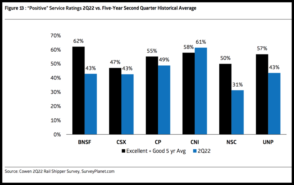 We also asked shippers if fuel costs are changing modal choices; 61% of shippers stated that fuel costs are changing modal choices, in line with our expectations, given that the price of U.S on-highway diesel is up approximately 60% year-to-date. Taken as a whole, we view both new questions we asked shippers as a net-neutral, given rail service has been a negative catalyst for the Class I railroads, while the cost of fuel has been a positive catalyst. While North American carloads are still approximately 6% below pre-COVID levels, we believe if the rails can clean up service metrics, there may be upside to volumes, given our assumption of the high cost of fuel for the intermediate term.