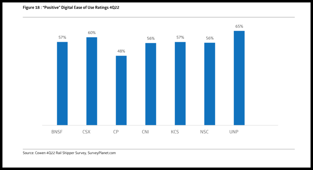 For the first time, we asked shippers to rate the Class I’s by digital ease of use and freight visibility as technology becomes an increasingly central part of rails’ efficiency strategies (see chart below). The average “positive” (excellent or good rating) rating of Class I’s digital ease of use was 57% with Union Pacific (UP) leading the group with a 65% score.