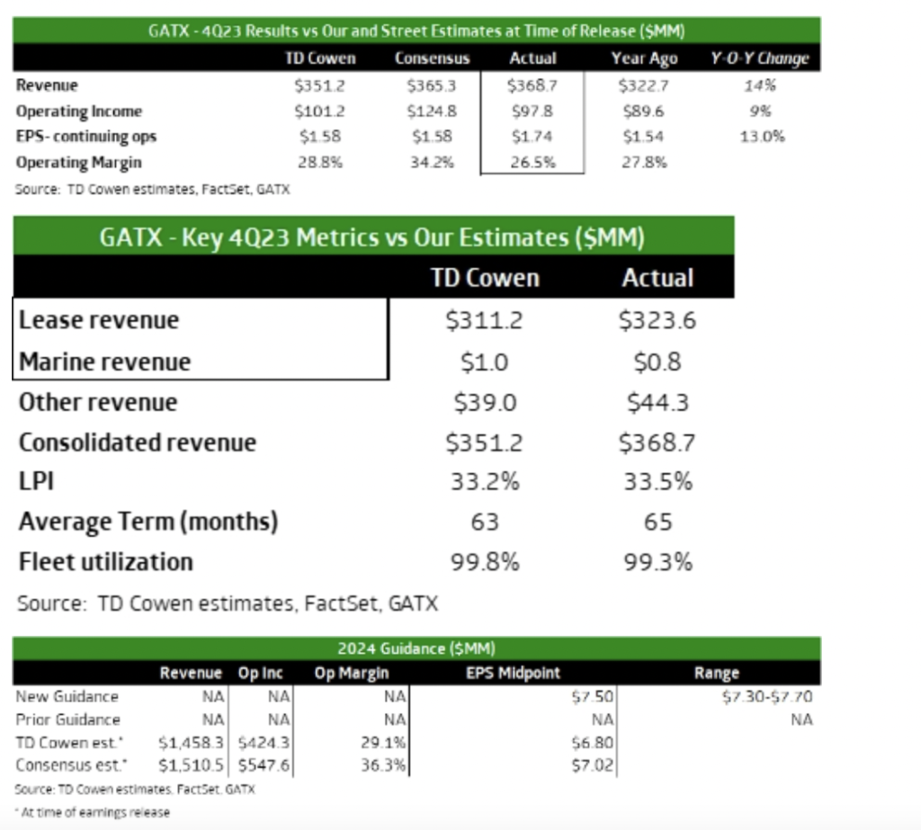 - Fleet utilization was 99.3% at the end of the fourth quarter, compared to 99.3% at the end of the prior quarter and 99.5% at 2022 year-end, GATX said.