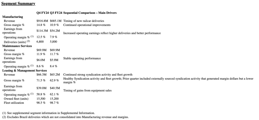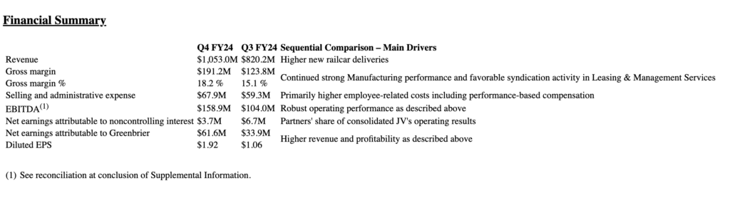 - Second-highest annual operating cash flow in Greenbrier history – Q4 and Fiscal 2024 operating cash flow reaches $192 million and $330 million, respectively.