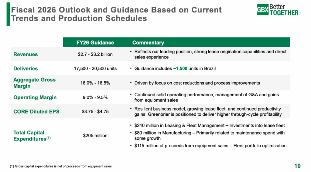 Based on current trends and production schedules, Greenbrier is providing the following guidance for fiscal 2026: