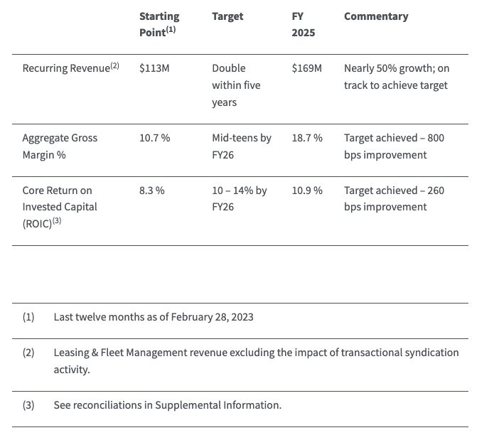 Greenbrier announced long-term financial targets in April 2023 at its first Investor Day. As of Aug. 31, 2025, the company says it has successfully surpassed two of its three financial targets, with the third on track, “reflecting sustained growth and strategic execution.” Detailed progress towards those targets is shown below.