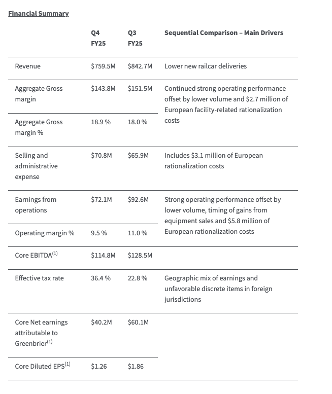Following are highlights of Greenbrier’s fourth fiscal quarter 2025: