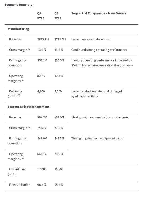 “As we enter fiscal 2026, we are navigating the current North American and European freight rail markets with a resilient business model, growing lease fleet, and continued productivity gains. We will continue to focus on operational efficiencies and execution to deliver higher through-cycle profitability and long-term shareholder value across market conditions,” concluded Tekorius.