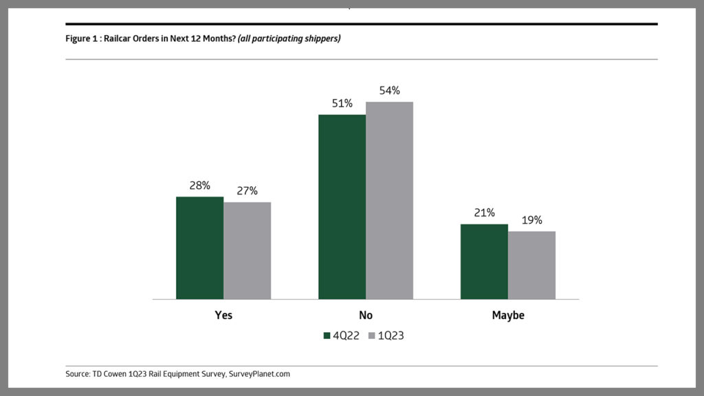 More on the Results: Roughly 46% of all shippers surveyed said they will or may order railcars in the next 12 months, down from 49% in our 4Q22 survey. Within the 46% of total shippers who are contemplating orders in the next 12 months, 59% said “yes,” they plan to place orders versus 58% in 4Q22; and 41% said “maybe” compared with 42% in 4Q22. This could mean a slightly increased level of certainty about ordering within the total shipper group.