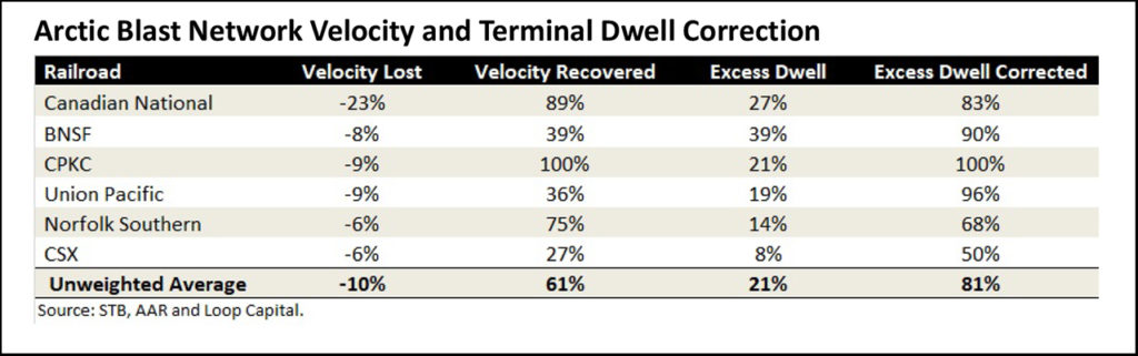 Using the averages along the bottom, the cold snap slowed the networks by an average of 10%, but through Feb. 2, 61% of that speed loss has been recovered. Similarly, the Arctic Blast pushed terminal dwell 21% above where it was in the week prior, but 81% of that excess dwell has now been corrected—good recoverability across the board.