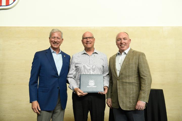 Hockett, center, with Chairman Lance Fritz, left, and Executive Vice President-Operations Eric Gehringer at the May 17 ceremony at Union Pacific Center.