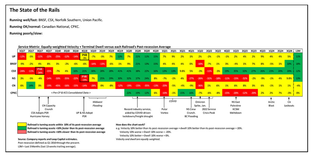 Norfolk Southern proved most resilient to the recent cold snap, at least according to the operating data, and in conjunction with an easy YoY operating comp posted a 7% improvement in both velocity and dwell in January. Operationally, this is the network on a hot streak as it catches up to the group off a lower base (2022 Service Crisis and 2023 East Palestine bottleneck). Against this big efficiency tailwind, we have, so far, modest volume headwind, with total loads down 2.3% QTD. Within this, intermodal is flat, but container volumes should improve as we move through the year as last year’s mix shift to the U.S. West coast (due to the East Coast port strike) normalizes.