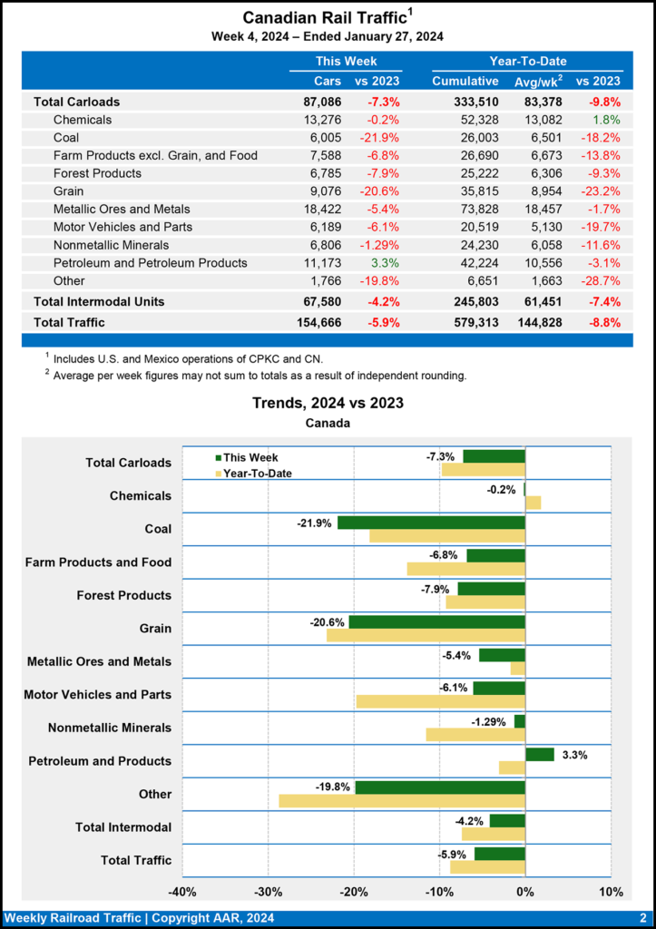 For the week ending Jan. 27, 2024, Canadian railroads reported 87,086 carloads, decreasing 7.3%, and 67,580 intermodal units, decreasing 4.2% from the same week in 2023. For the first four weeks of 2024, they reported cumulative rail traffic volume of 579,313 carloads, containers and trailers, down 8.8%.