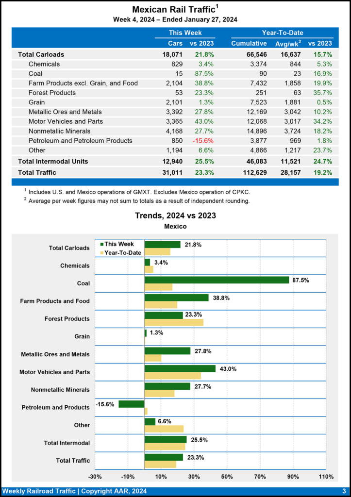 For the week ending Jan. 27, 2024, Mexican railroads reported 18,071 carloads, a 21.8% gain over the same week last year, and 12,940 intermodal units, a 25.5% gain. Their cumulative volume for the first four weeks of 2024 was 112,629 carloads and intermodal containers and trailers, rising 19.2% from the prior-year period.