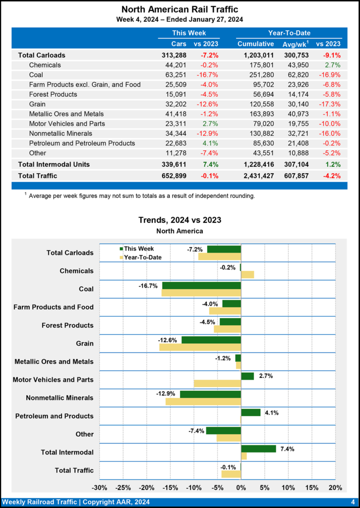 North American rail volume for the week ending Jan. 27, 2024, on 12 reporting U.S., Canadian and Mexican railroads totaled 313,288 carloads, down 7.2% compared with the same week last year, and 339,611 intermodal units, up 7.4% compared with last year. Total combined weekly rail traffic in North America was 652,899 carloads and intermodal units, down 0.1%. North American rail volume for the first four weeks of 2024 came in at 2,431,427 carloads and intermodal units, a 4.2% fall-off from the same period in 2023.
