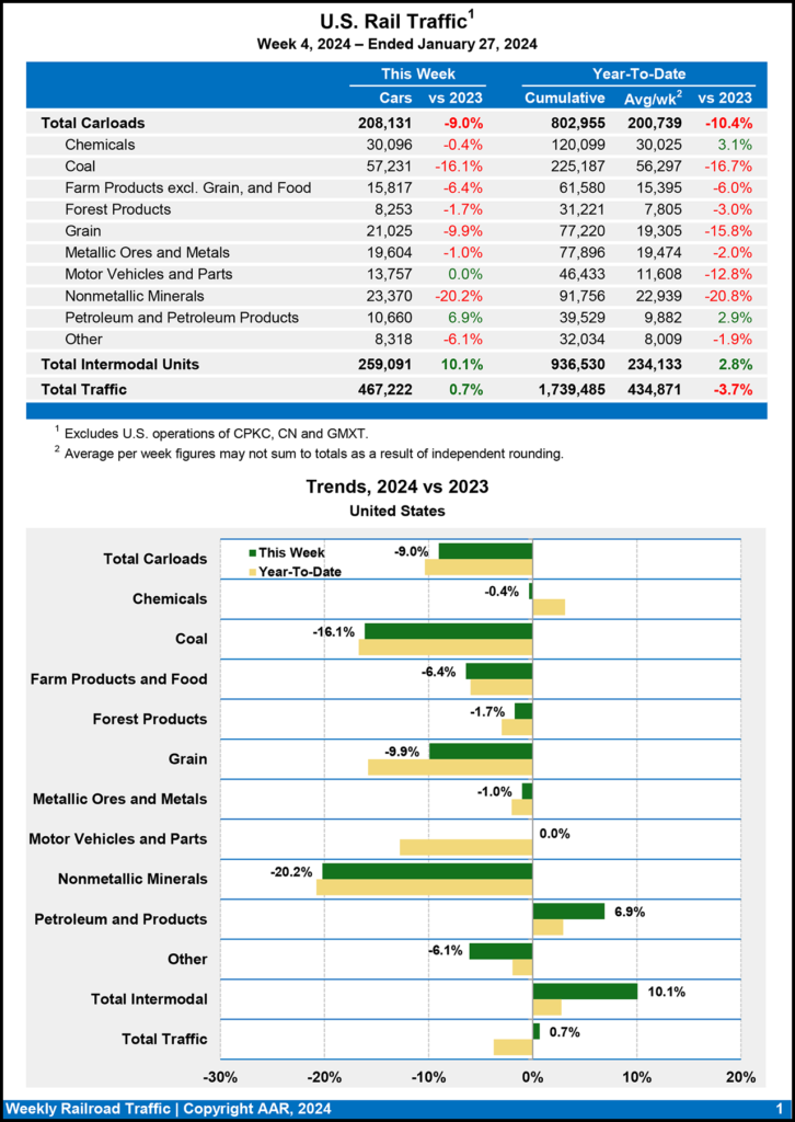 U.S. Class I railroads hauled 467,222 carloads and intermodal units for the week ending Jan. 27, 2024—up 0.7% from the same point last year, AAR reported Jan. 31. Total carloads came in at 208,131, down 9.0% from 2023, while U.S. weekly intermodal volume was 259,091 containers and trailers, up 10.1% from 2023.