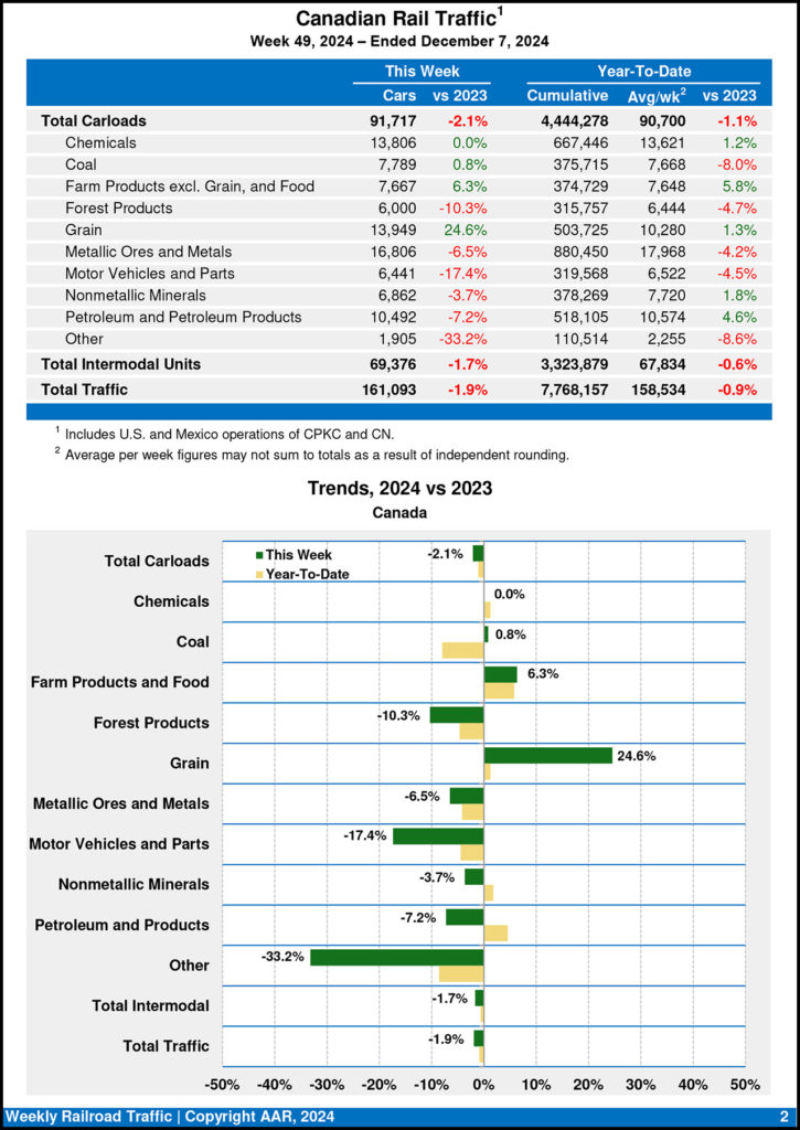 Canadian railroads reported 91,717 carloads for the week ending Dec. 7, 2024, down 2.1%, and 69,376 intermodal units, down 1.7% from the prior-year period. For the first 49 weeks of this year, they reported cumulative rail traffic volume of 7,768,157 carloads, containers and trailers, down 0.9%.