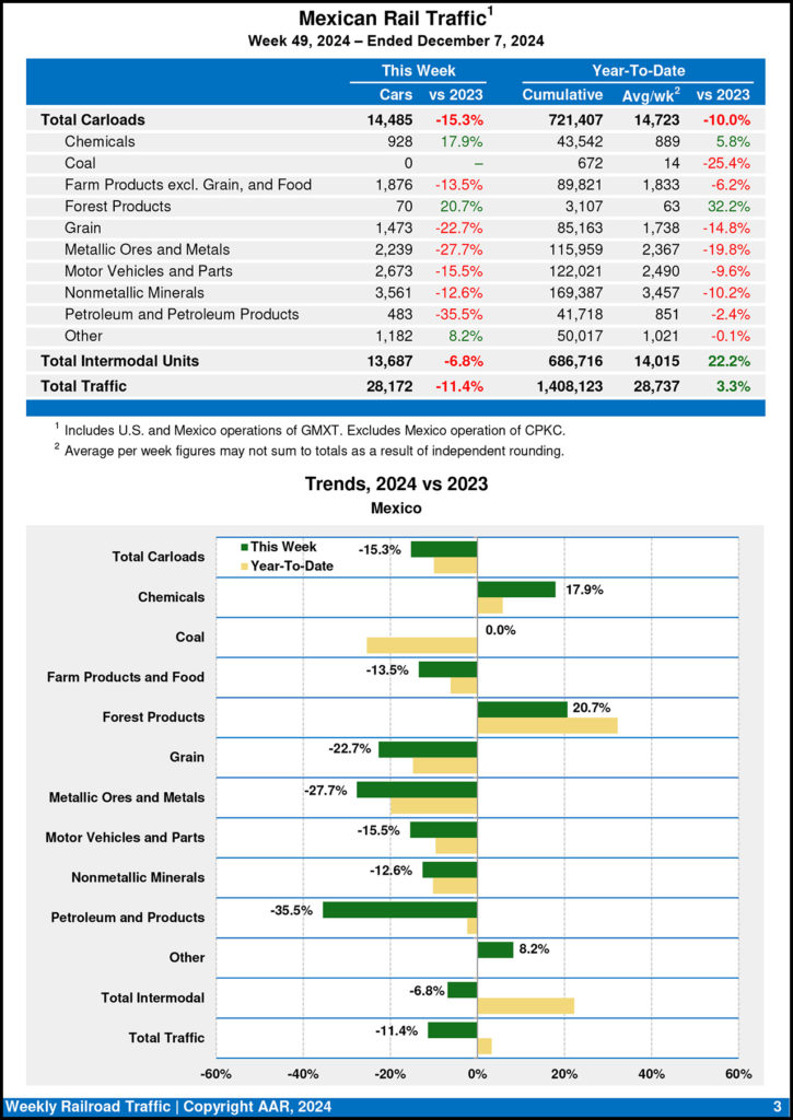 For the week ending Dec. 7, 2024, Mexican railroads reported 14,485 carloads, dropping 15.3% from the same week last year, and 13,687 intermodal units, decreasing 6.8%. Their cumulative volume for the first 49 weeks of 2024 was 1,408,123 carloads and intermodal containers and trailers, rising 3.3% from the same point last year.