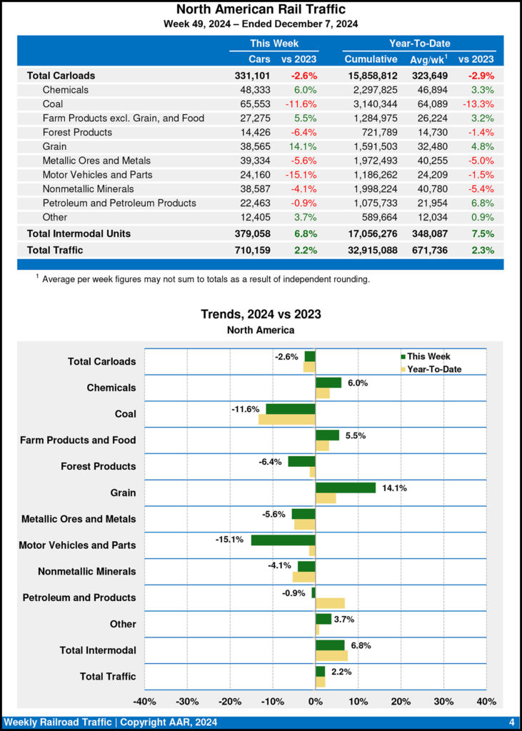 For the first 49 weeks of this year, U.S. railroads reported cumulative volume of 10,693,127 carloads, a 3.1% fall-off from the same point in 2023; and 13,045,681 intermodal units, a 9.1% gain over 2023. Total combined U.S. traffic for the first 49 weeks of 2024 was 23,738,808 carloads and intermodal units, an increase of 3.3% from last year.