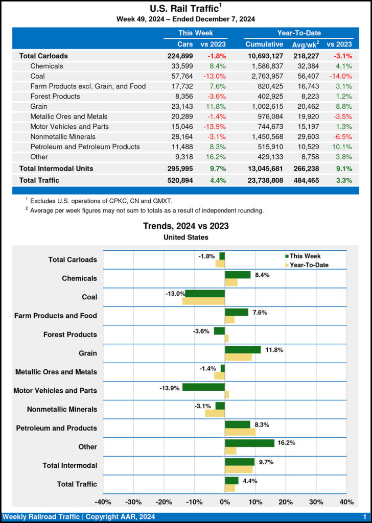U.S. Class I railroads hauled 520,894 carloads and intermodal units for the week ending Dec. 7, 2024, the AAR reported Dec. 11. Total carloads came in at 224,899, dipping 1.8%, while intermodal volume was 295,995 containers and trailers, rising 9.7% from the same week in 2023.