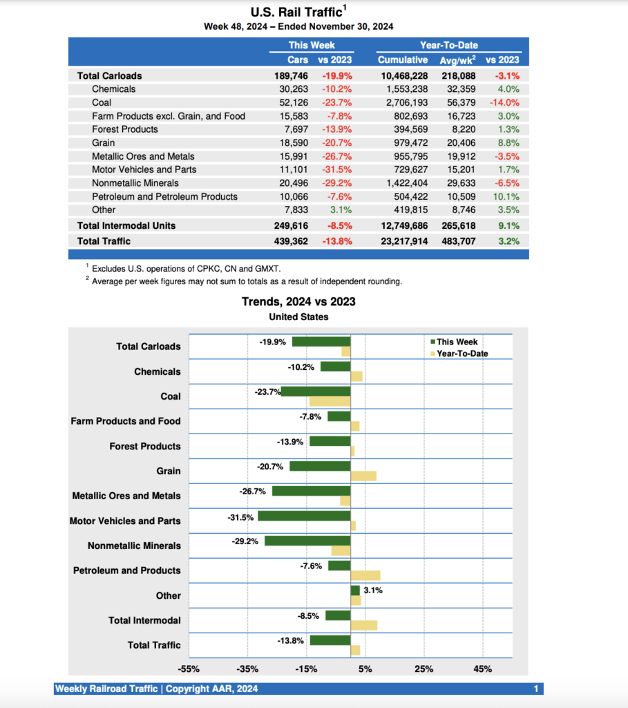 U.S. rail traffic for the week ending Nov. 30, 2024 (Week 48) came in at 439,362 carloads and intermodal units, down 13.8% from the same week last year, which did not include the Thanksgiving holiday, based on 189,746 carloads—down 19.9% from 2023—and intermodal volume of 249,616 containers and trailers—down 8.5% from 2023, the Association of American Railroads (AAR) reported Dec. 4.