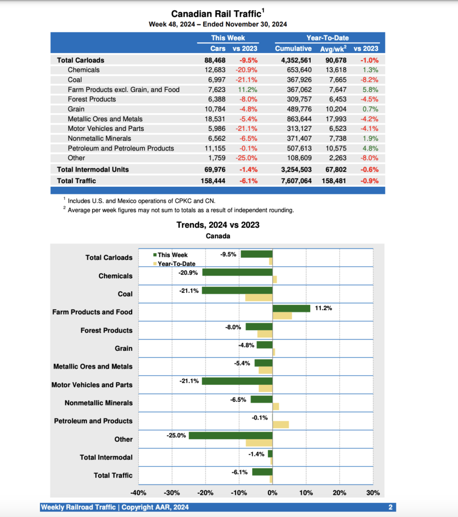 Canadian railroads reported 88,468 carloads for the week ending Nov. 30, 2024, down 9.5%, and 69,976 intermodal units, down 1.4% from the same point last year. For the first 48 weeks of 2024, they reported cumulative rail traffic volume of 7,607,064 carloads, containers and trailers, down 0.9%.