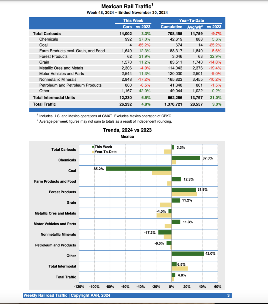 Mexican railroads reported 14,002 carloads for the week ending Nov. 30, 2024, up 3.3% compared with the same week last year, and 12,230 intermodal units, up 6.5%. Cumulative volume on Mexican railroads for the first 48 weeks of 2024 was 1,370,721 carloads, containers and trailers, up 3.0% from the same point last year.
