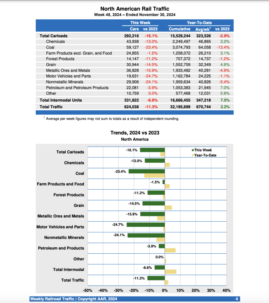 For the first 48 weeks of 2024, U.S. railroads reported cumulative volume of 10,468,228 carloads, a 3.1% fall-off from the same point last year; and 12,749,686 intermodal units, a 9.1% gain over last year. Total combined U.S. traffic for the first 48 weeks of this year came in at 23,217,914 carloads and intermodal units, rising 3.2% from 2023.