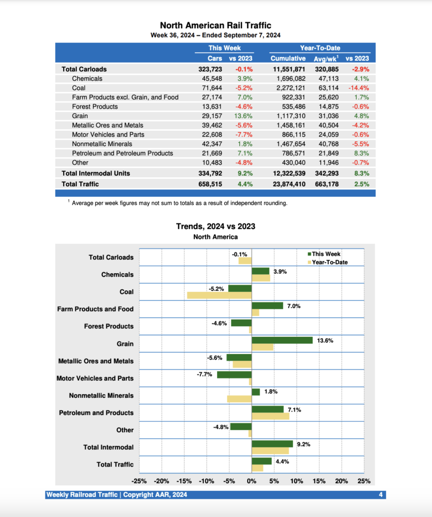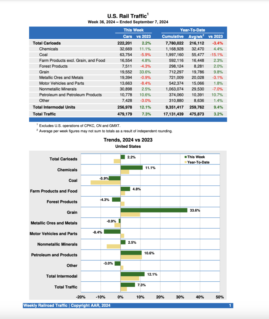 Weekly rail traffic volumes are up again over the prior-year period, according to the latest Association of American Railroads (AAR) report, but Week 36 (ending Sept 7, 2024) was the fourth in a row to see gains in carloads and intermodal units.