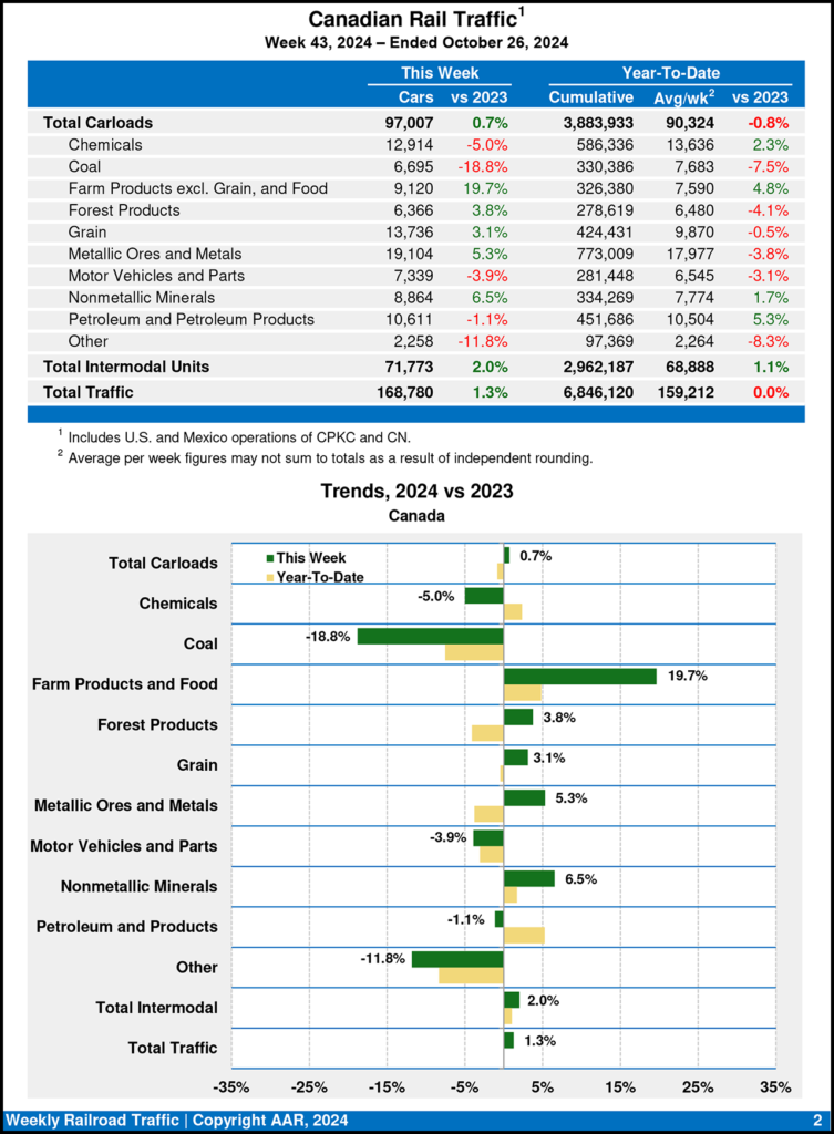 Canadian railroads reported 97,007 carloads for the week ending Oct. 26, 2024, up 0.7%, and 71,773 intermodal units, up 2.0% from the same point last year. For the first 43 weeks of 2024, they reported cumulative rail traffic volume of 6,846,120 carloads, containers and trailers, flat with 2023.
