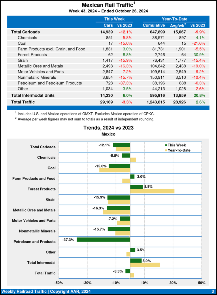 For the week ending Oct. 26, 2024, Mexican railroads reported 14,939 carloads, dropping 12.1% from the prior-year period, and 14,230 intermodal units, rising 8.0%. Their cumulative volume for the first 43 weeks of this year was 1,243,815 carloads and intermodal containers and trailers, up 2.6% from 2023.