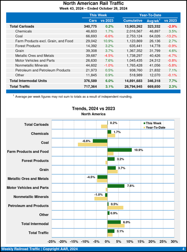 North American rail volume for the week ending Oct. 26, 2024, on nine reporting U.S., Canadian and Mexican railroads totaled 340,775 carloads, up 0.2% compared with the same week last year, and 376,589 intermodal units, up 6.0% compared with last year. Total combined weekly rail traffic in North America was 717,364 carloads and intermodal units, increasing 3.1%. North American rail volume for the first 43 weeks of 2024 was 28,794,945 carloads and intermodal units, a 2.3% increase from 2023.