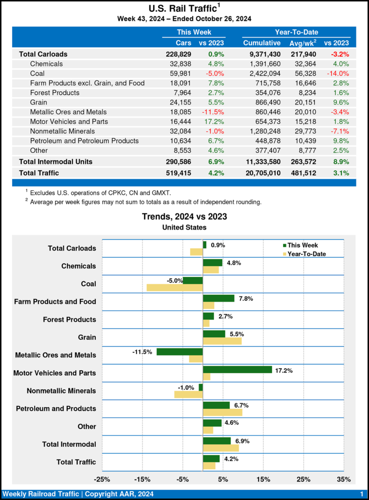 U.S. rail traffic for the week ending Oct. 26, 2024 (Week 43) came in at 519,415 carloads and intermodal units, up 4.2% from the same week last year, based on 228,829 carloads—up 0.9% from 2023—and intermodal volume of 290,586 containers and trailers—up 6.9% from 2023, the Association of American Railroads (AAR) reported Oct. 30.