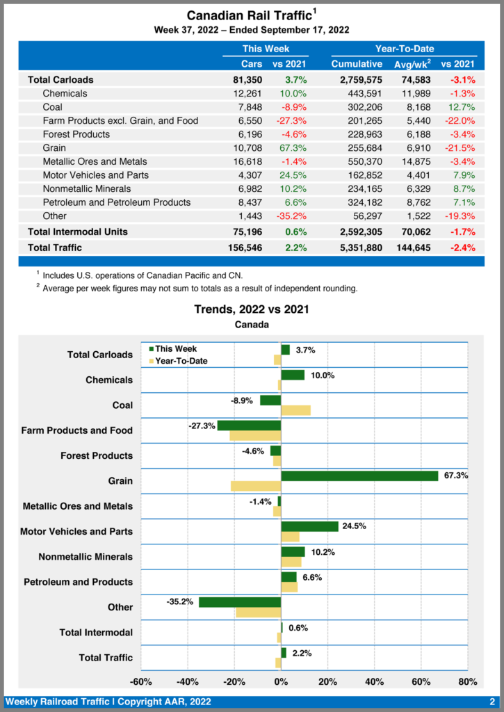 Canadian railroads reported 81,350 carloads for the week, a 3.7% increase, and 75,196 intermodal units, a 0.6% increase from the same week in 2021. For the first 37 weeks of 2022, they reported cumulative rail traffic volume of 5,351,880 carloads, containers and trailers, decreasing 2.4%.
