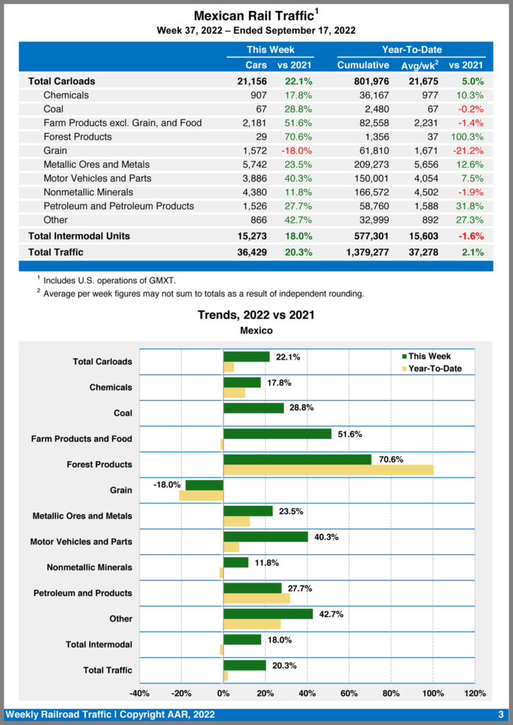 Mexican railroads reported 21,156 carloads for the week ending Sept. 17, 2022, a 22.1% gain compared with the year-earlier period, and 15,273 intermodal units, a 18% gain. Their cumulative volume for the first 37 weeks of 2022 was 1,379,277 carloads and intermodal containers and trailers, up 2.1% from 2021.