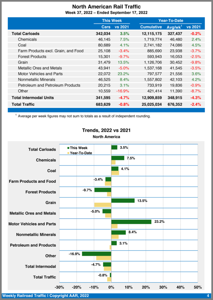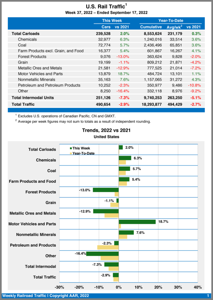U.S. Class I railroads hauled 490,654 carloads and intermodal units for the week ending Sept. 17, 2022, down 2.9% from the prior-year period, according to AAR. Total carloads came in at 239,528, up 2%, while intermodal volume was 251,126 containers and trailers, down 7.3% compared with 2021. (Total U.S. traffic was also down in Week 36, but both carloads and intermodal volume declined.)