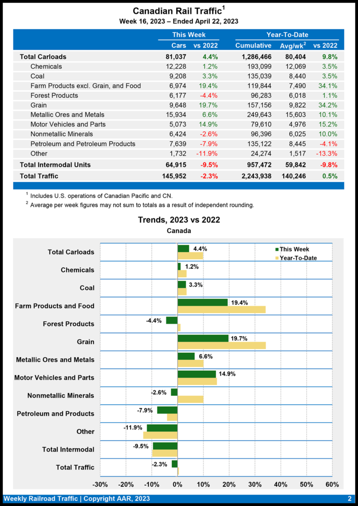 Canadian railroads reported 81,037 carloads for the week, up 4.4%, and 64,915 intermodal units, down 9.5% compared with the same week in 2022. For the first 16 weeks of 2023, they reported cumulative rail traffic volume of 2,243,938 carloads, containers and trailers, up 0.5%.