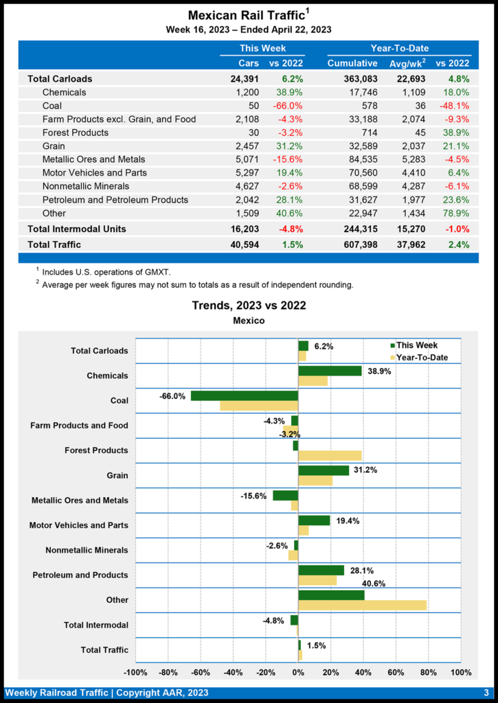 Mexican railroads reported 24,391 carloads for the week, up 6.2% vs. the same week last year, and 16,203 intermodal units, down 4.8%. Their cumulative volume for the first 16 weeks of 2023 was 607,398 carloads and intermodal containers and trailers, up 2.4% from the same point last year.