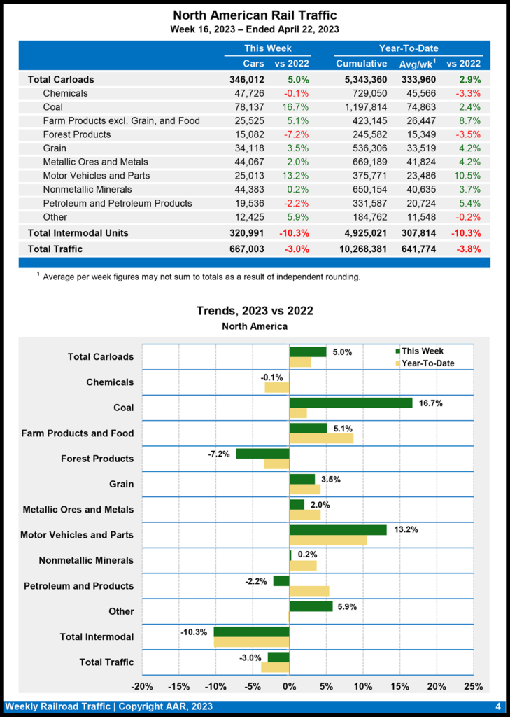 North American rail volume for the week ending April 22, 2023, on 12 reporting U.S., Canadian and Mexican railroads totaled 346,012 carloads, up 5.0% compared with the same week last year, and 320,991 intermodal units, down 10.3% compared with last year. Total combined weekly rail traffic in North America was 667,003 carloads and intermodal units, dipping 3.0%. North American rail volume for the first 16 weeks of 2023 was 10,268,381 carloads and intermodal units, falling 3.8% compared with 2022.