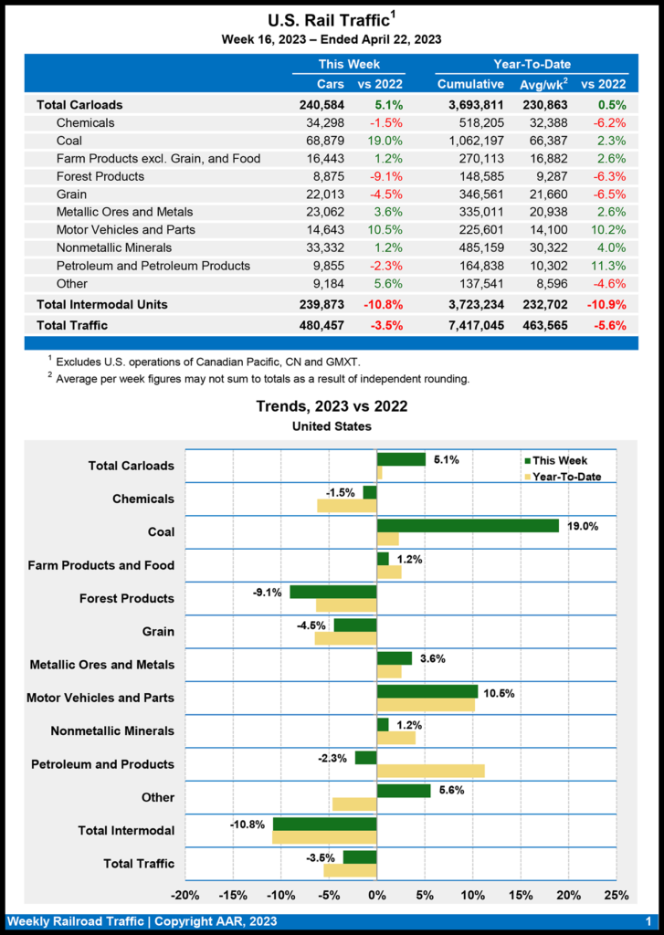 For the first 16 weeks of 2023, U.S. railroads reported cumulative volume of 3,693,811 carloads, up 0.5% from the same point last year; and 3,723,234 intermodal units, down 10.9% from last year. Total combined U.S. traffic for the first 16 weeks of 2023 was 7,417,045 carloads and intermodal units, a 5.6% drop-off compared with last year.