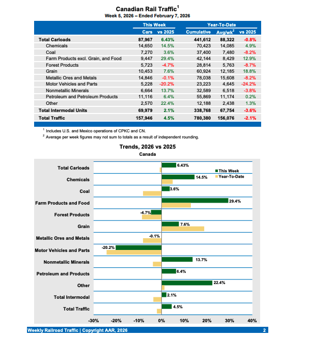 Canadian railroads reported 87,967 carloads for the week ending Feb. 7, 2026, up 6.4%, and 69,979 intermodal units, up 2.1% from the prior-year period. For the first five weeks of this year, they reported cumulative rail traffic volume of 780,380 carloads, containers, and trailers, down 2.1%.