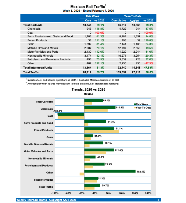 For the week ending Feb. 7, 2026, Mexican railroads reported 13,348 carloads, up 69.1% compared with the same week last year, and 13,364 intermodal units, up 51.3%. Cumulative volume on Mexican railroads for the first five weeks of 2026 was 139,557 carloads and intermodal containers and trailers, up 38.0% from the same point last year.