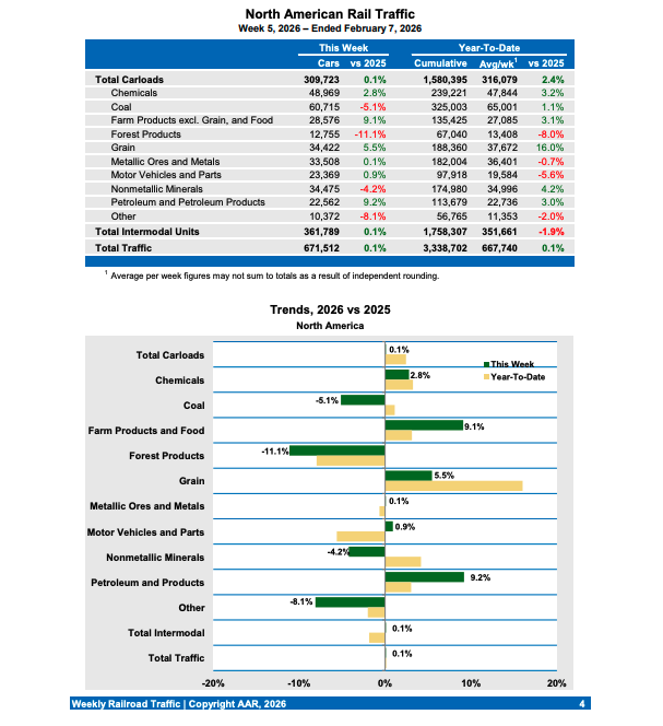 North American rail volume for the week ending Feb. 7, 2026, on nine reporting U.S., Canadian and Mexican railroads totaled 309,723 carloads, up 0.1% compared with the same week last year, and 361,789 intermodal units, up 0.1% compared with last year. Total combined weekly rail traffic in North America was 671,512 carloads and intermodal units, up 0.1%. North American rail volume for the first five weeks of 2026 was 3,338,702 carloads and intermodal units, up 0.1% compared with 2025.