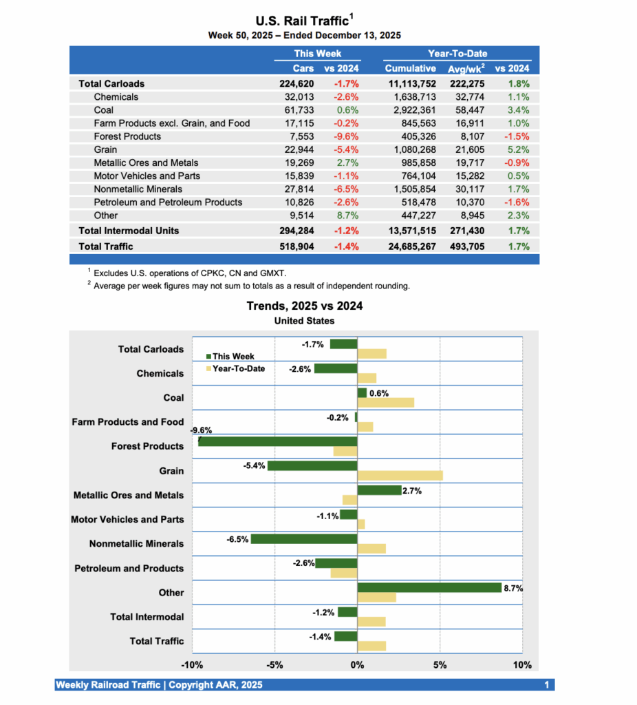 For the week ending Dec. 13, 2025, total U.S. rail traffic came in at 518,904 carloads and intermodal units, comprising 224,620 carloads, down 1.7% compared with the same week in 2024, and 294,284 containers and trailers, down 1.2% compared with 2024, AAR reported.