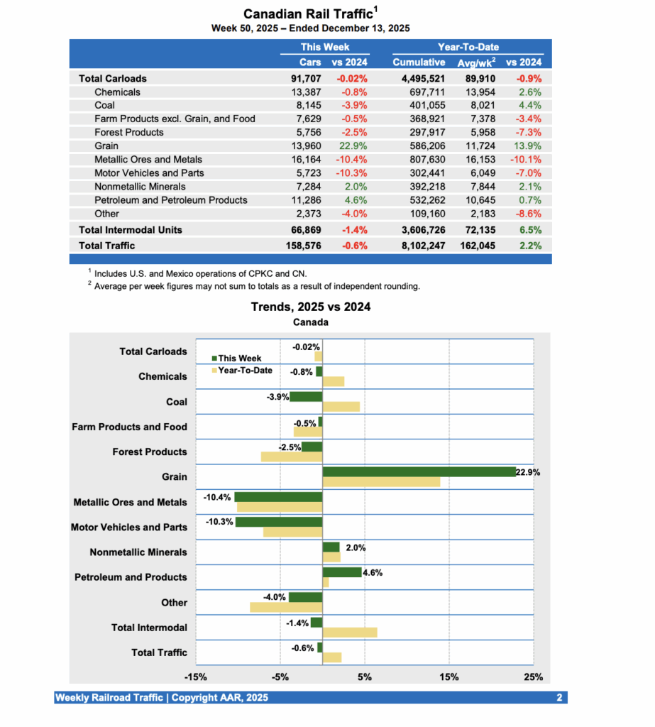 For the week ending Dec. 13, 2025, Canadian railroads reported 91,707 carloads, down 0.02%, and 66,869 intermodal units, down 1.4% from the prior-year period. For the first 50 weeks of this year, they reported cumulative rail traffic volume of 8,102,247 carloads, containers, and trailers, up 2.2%.