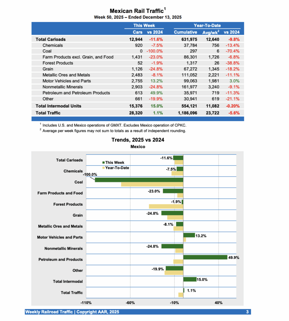 Mexican railroads reported 12,944 carloads for the week ending Dec. 13, 2025, down 11.6% from the same week last year, and 15,376 intermodal units, an increase of 15.0%. Their cumulative volume for the first 50 weeks of this year was 1,186,096 carloads and intermodal containers and trailers, down 5.6% from the same point in 2024.