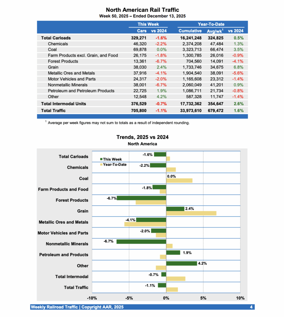 Total U.S. carload and intermodal traffic for the week ending Dec. 13, 2025, dipped 1.4% from the same point last year, marking the 10th consecutive week of fall offs, according to the Association of American Railroads’ (AAR) latest report, released Dec. 17.